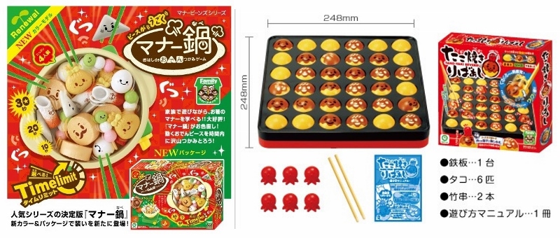 何も甘いお菓子ものだけでなく、上の様に【おでん】を模した「箸のマナー」を学ぶことができる【マナー鍋】だとか、【たこ焼き器】を模した「リバーシ」ゲームを楽しむことができる【たこ焼きりばぁし】なども家族や仲間と遊ぶパーティーゲームとしては魅力的。